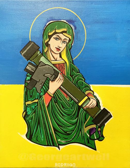When I first saw the image of "Saint Javelin" I loved the use of the orthodox icon with the addition of the Javelin rocket launcher produced by the United States of America. Since the tension is so high between the democratic and free world and the authoritarian Russian regime. No direct help could be given to the heroic Ukrainians for their military and civil to use to defend themselves from the invasion. Since Russia's' macabre symbols are columns of tanks with the letter "Z" roughly painted on their sides, "saint Javelin" became the symbol of resistance and of Russian stalling in Ukraine military. This painted/ symbol came with many levels of meaning. It was also meant to communicate informally that help is on the way. To this date the world have supplied more than 17000 rocket launchers like the Javelin to Ukrainians, thus why they call her/it "protector of Ukraine"