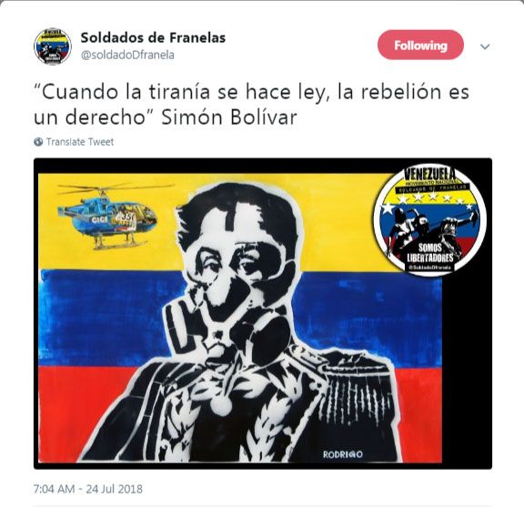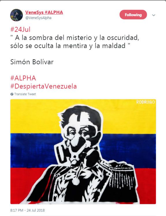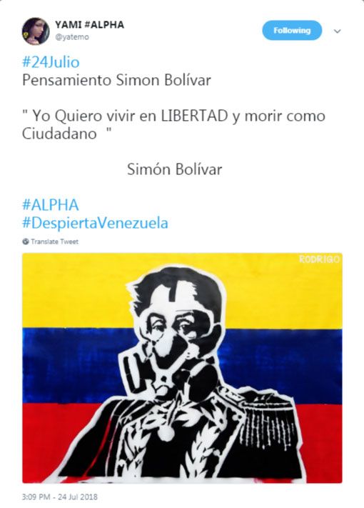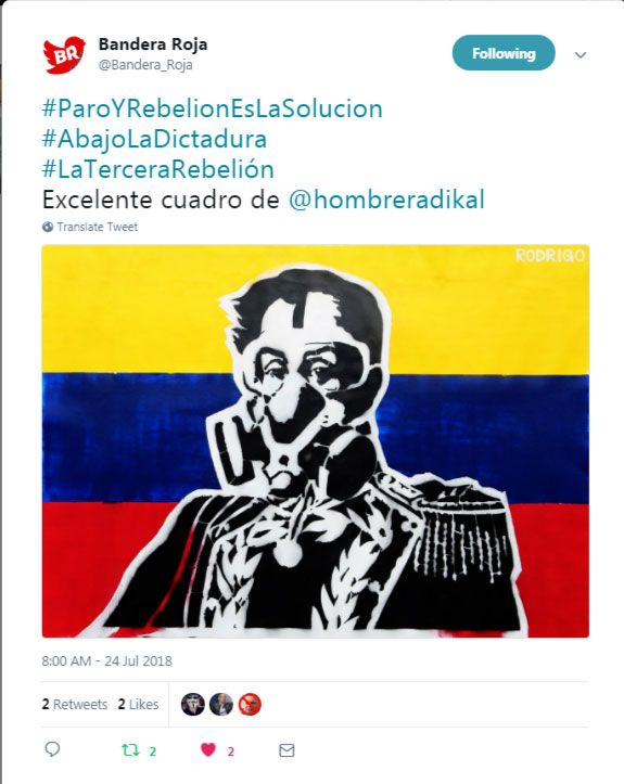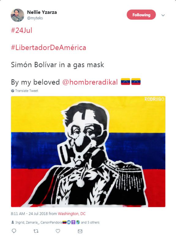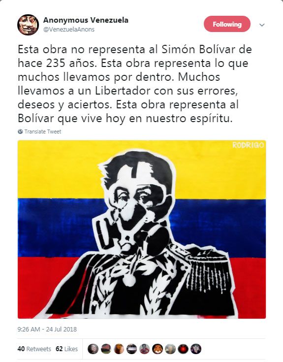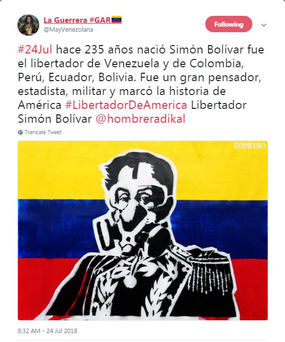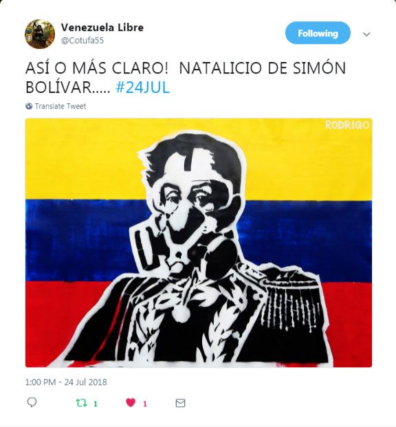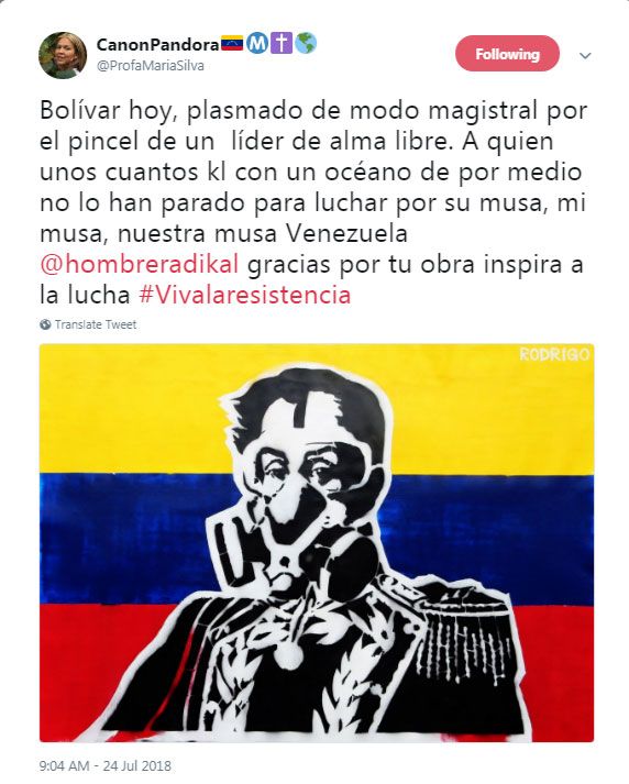 This is meaningful in the sense that even influencers from different parties that dislike each other used it as a common denominator, from extreme right to extreme left passing through all other tendencies (anarchist, democrats, radicals, etc). All these tweets were produced the same day (24th of July for Bolivar's anniversay day) This is a form to expose art using the new technologies that goes way beyond the simple exposure in a physical place. This makes the piece "Bolivar in a gas mask" a sort of cultural and ideological reference for the whole Venezuelan people. In this article were selected a series of the most representative tweets to illustrating this dynamic.