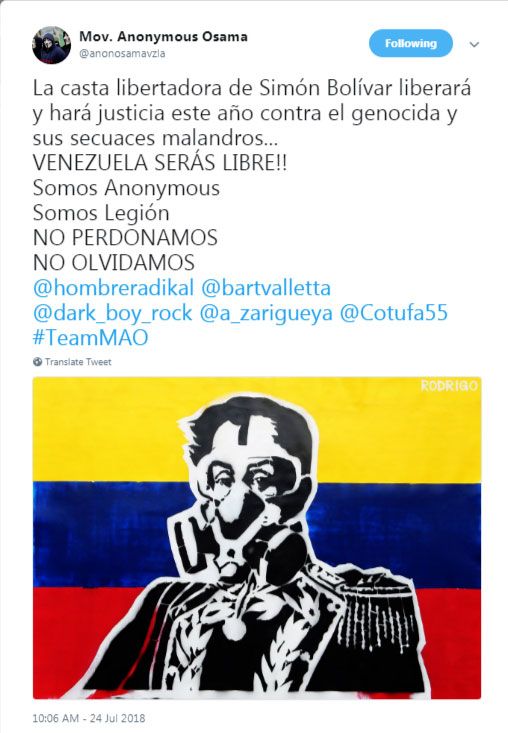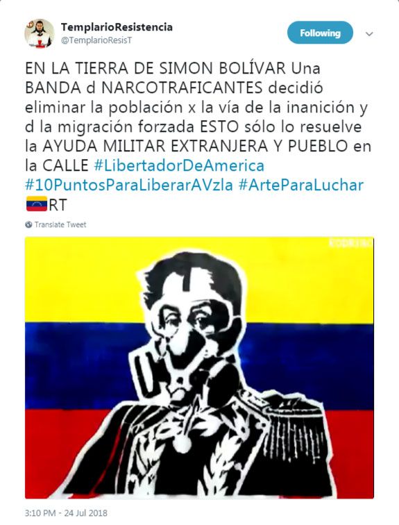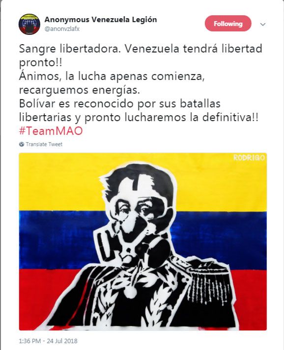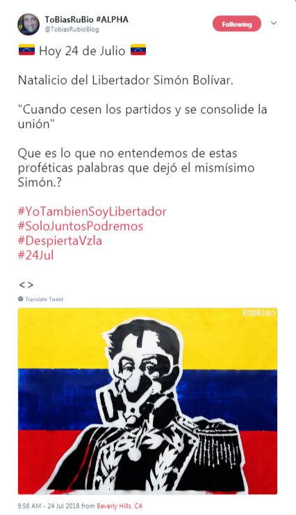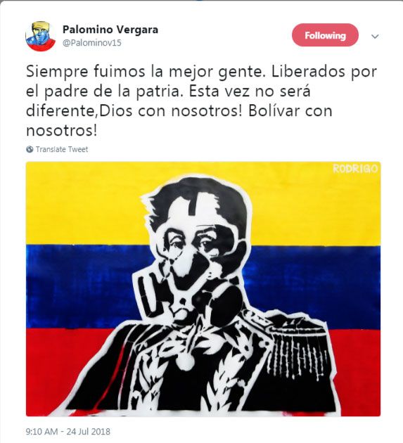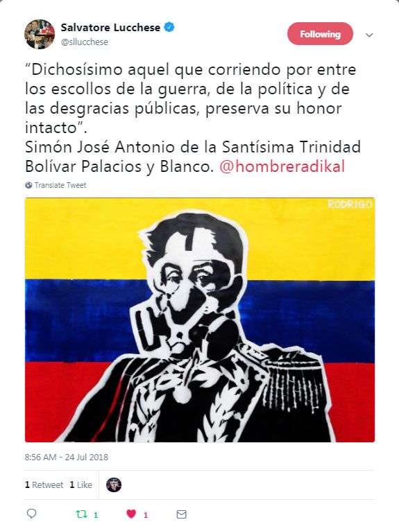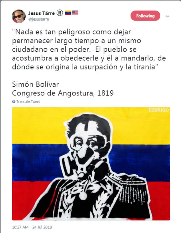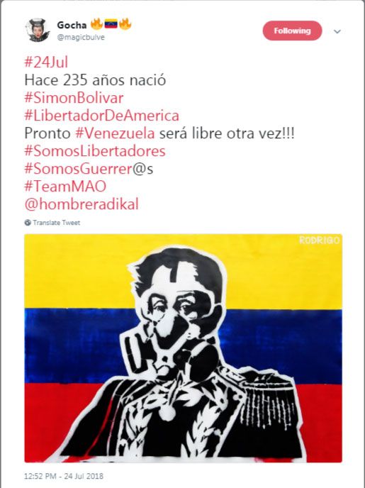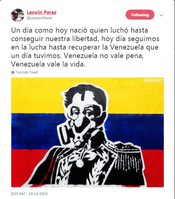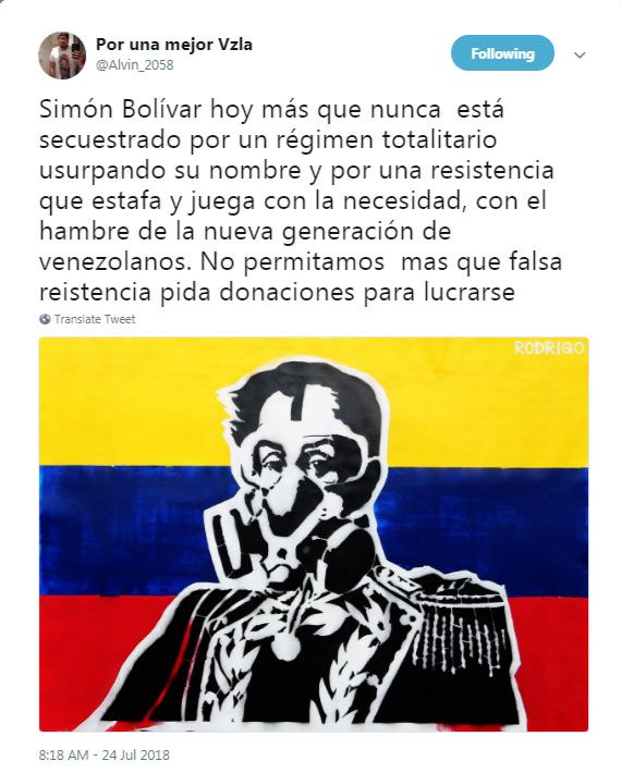 This is meaningful in the sense that even influencers from different parties that dislike each other used it as a common denominator, from extreme right to extreme left passing through all other tendencies (anarchist, democrats, radicals, etc). All these tweets were produced the same day (24th of July for Bolivar's anniversay day) This is a form to expose art using the new technologies that goes way beyond the simple exposure in a physical place. This makes the piece "Bolivar in a gas mask" a sort of cultural and ideological reference for the whole Venezuelan people. In this article were selected a series of the most representative tweets to illustrating this dynamic.