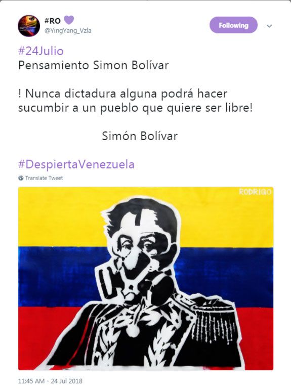 The piece "Bolivar in a gas mask" was made in 2014 and ever since it has been viral and used by people as profile pictures, in prints in protests and even tattooed by many. This 24th of July 2018 was Simon Bolivars anniversary date and many important influencers accounts from Venezuela's blogosphere used the image to illustrate their tweets and to pass a message of hope and wishes for freedom, this made the piece a reference and a modern symbol, as stated before, that became utterly viral and produced common identity and comprehension of the situation of crisis that undergoes Venezuela.