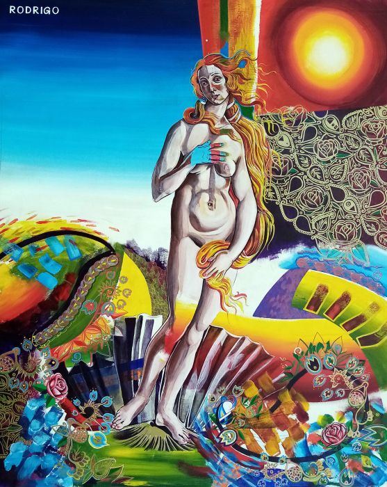 I painted the central figure of Venus and directed the composition efforts in a mix of spontaneous and improvised "garden" of colors and shapes with a very controlled idea of distribution of weight of elements and color. It is very hard to achieve a proper coherent composition whilst working with another artist but this piece came out very nice and effective because there was a great feeling of empathy and even love between us when we painted it together. This is a warm and light full piece that meant a break from my usual social and political heavy and serious subjects that seams and looks light even though there are uncountable hours of work on it. The title translates to "July's Venus" and at that time the collaborating hand of Giulia felt like she was my fruit bearing Venus of life in a very hard world.