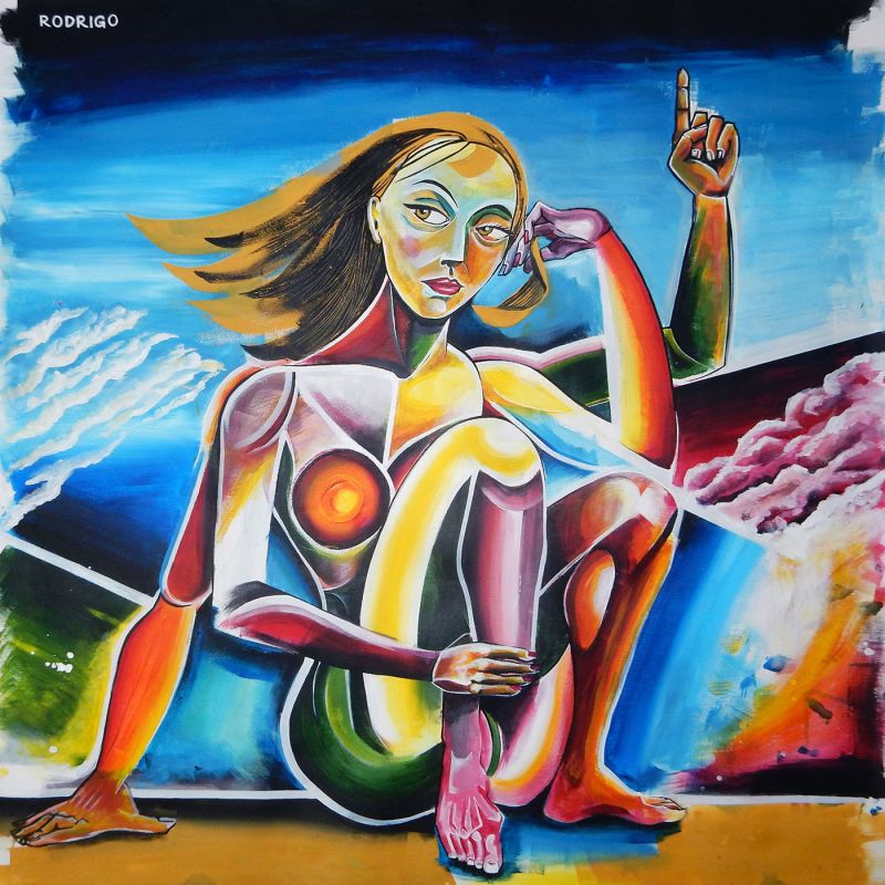 This piece is a call back to my early period style using my actual technique and stroke. It bears philosophical symbolism confronting macro and micro. It comprises a recall from another piece entitled "Thinking girl" when it comes to the position of the woman figure and I follow my general contrast and contraposition method in it in a very spontaneous, yet more controlled and less organic, manner. It's a sort of "faux cubism" in it's form. It is obviously a conversation driven piece open for discussion and interpretations.