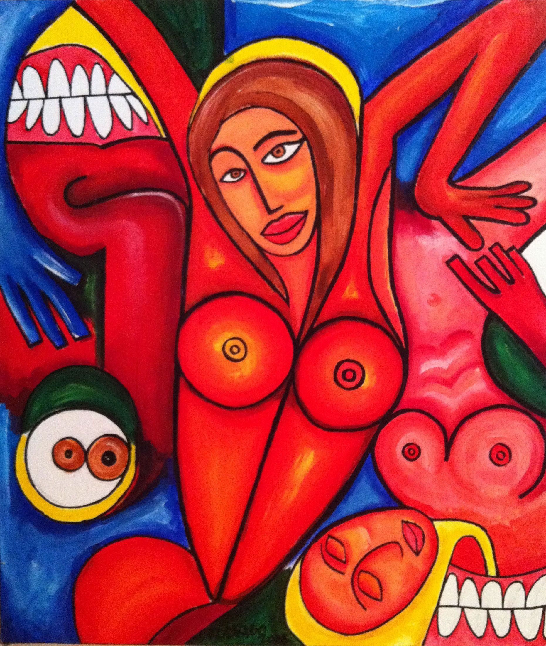 "La Femme 3" is an acrylic paint form 2006. It's a typical and early recurrent subject in the my early work universe: The woman thematic and the interaction with absolute abstraction of expression with overlaping thematic like big embrangled faces in the composition. Much of this pieces where "freestyles" using a loose pattern that I repeated with variations over and over. I liked to play with trompe l'oeil in this period (overlapping of figures and different ways to perceive the piece) I'd like to Note that the face theme is also there and appears when the painting is flipped upside down.