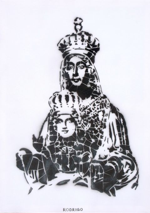 La Madonna Nera del Sacro Monte di Viggiano is the "Regina of Lucania" (The Queen of the Lucanian people) The Patron Virgin of the whole region of Basilicata in the south of Italy. The Madonna Nera has the particularity of being the only black virgin of the continental Italy. She's kept at the Basilica at Viggiano's village and she's taken once up the mountain and back a year. I decided to make this version with the stencil modern technique in order to give it an updated version mixing tradition and modernity in the same vein I did it with "San Gianuario Piange" the Patron saint of Marsico Nuovo.