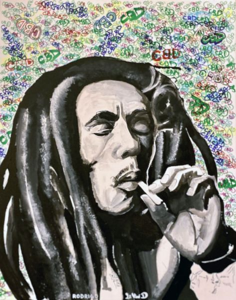The piece came out smooth because we have been friends for a long time. Mike also used to play DJ for us when I was a rapper with the band Los De La Salsa in Switzerland so we understand and have the experience about team work, not to mention we used to play battle video games too! This piece worked real well because he had empathy and came up with the idea from my perspective and at the same time I was honored and happy to make it a reality on canvas ith that same day. I call it a conversational piece. Would Bob smoke CBD?