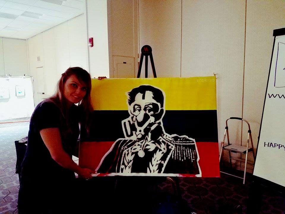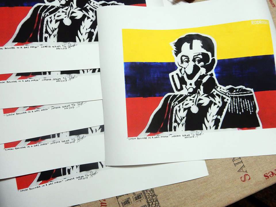 Here are some pictures of people and situations in which the piece "Simon Bolivar in a Gas mask" had some impact and symbolism. From left to right: The guatemalan politologist Gloria Álvarez, a Stencil in Wynwood Miami art district proped by street artists Mstrmnd & RCR7 and some regular people using printed copies of the piece in protests in Caracas of 2017.