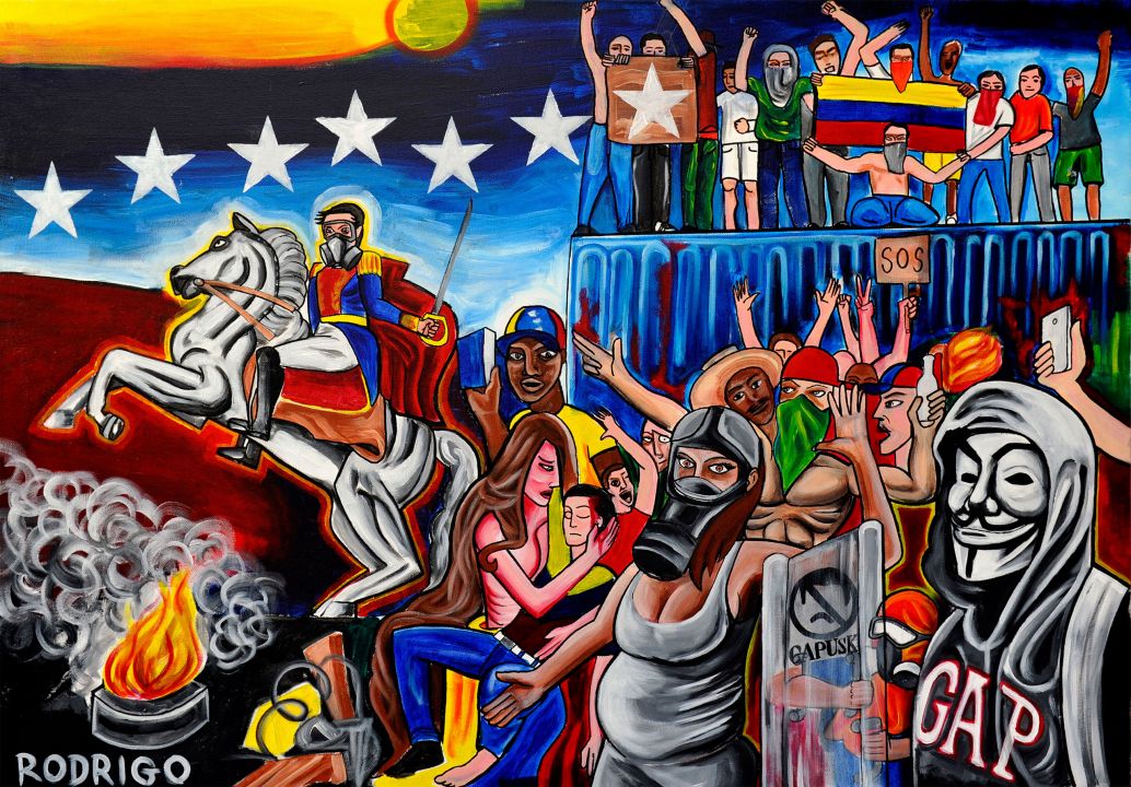 This is one of the most important pieces for me, It became an instant icon when I published in social networks in 2014. It was the first creation through painting and technology to put the protests of Venezuela in art. It opened me doors to high level militancy with Anonymous and recognition and admiration from a whole generation in Venezuela. This piece is historic for Venezuela. It represents the protests of 2014. It is full of symbolic and meanings. The BBC published it in an article describing it as "one of the most representatives pieces of 2014".