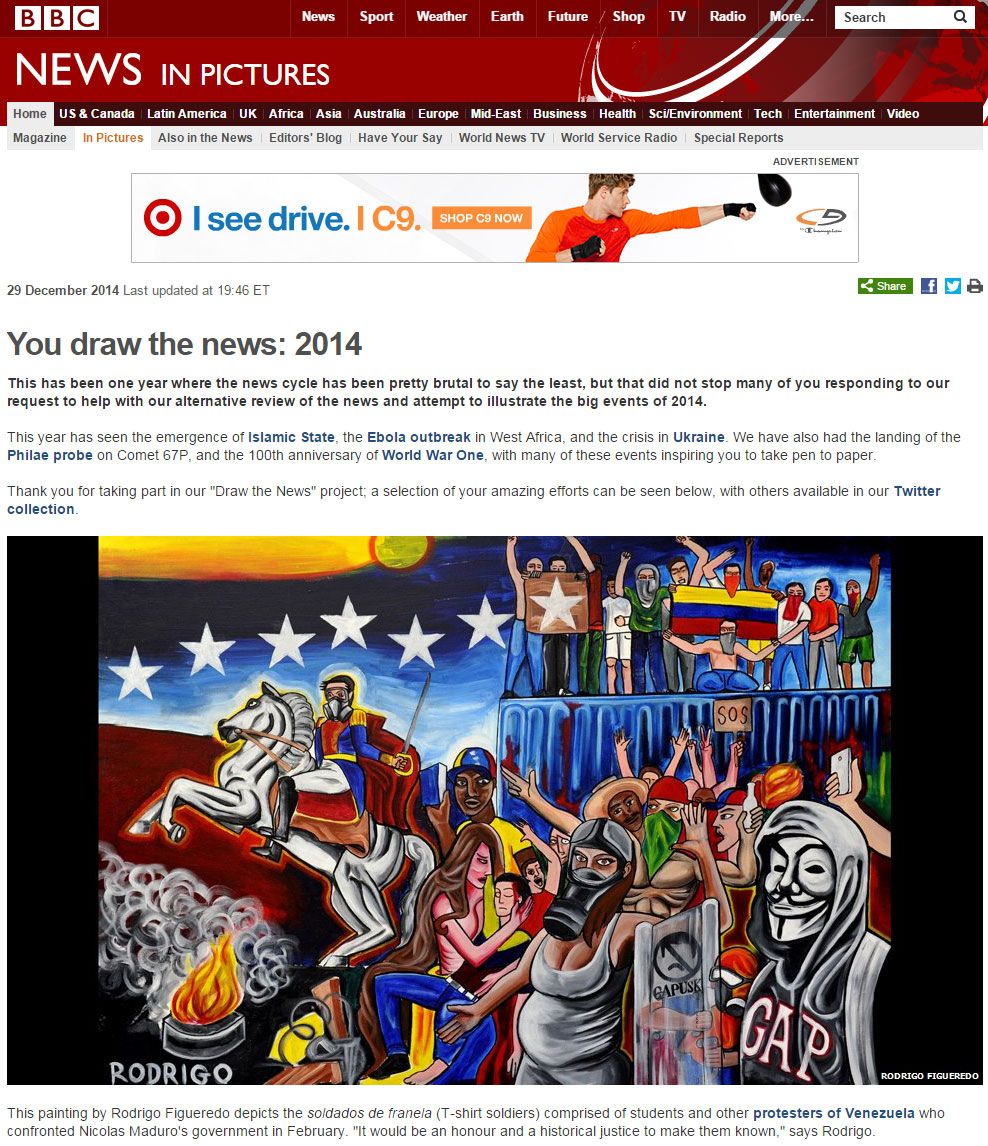 This is a screen shot of the BBC's Article that opens with the piece "Batalla" in late December 2014. The author considers it to be one of the 10 most representative images of 2014 and the article makes it the first image. It also sites me "It would be an honor and a historical justice to make them known" when I argue the importance and the cause of the "Soldados de Franela" and Venezuela's people illustrated there. Art as testimony, but also as a form of act of rebellion and an instrument to fight for a cause: Freedom.
