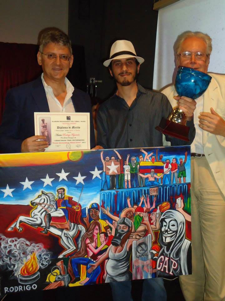 That same year it won 2nd price of the "Accademia internazionale Alfonso Grassi" and was 1st exposed at "Miami River art Fair" in 2015 in Florida, USA. There's one copy of it at "El Arepazo 2" in Miami which is the central place of Venezuelans for politics in Doral Miami. This piece is waiting to go back to Venezuela because it's where it should be to make a statement for history, it has been signed on the back by mayor actors on the Venezuelan situation. I'm very proud and humbled by my people and the interaction making this piece produced for both.