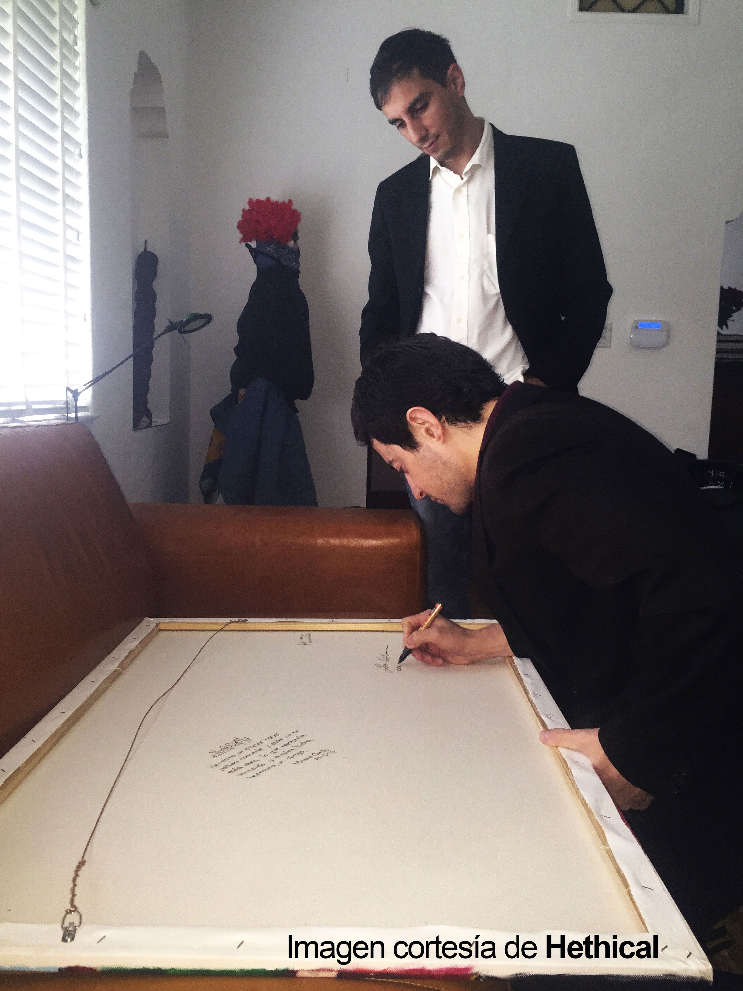 Thor Halvorssen signing the reverse of "Batalla" in Miami 2014. That same day I gave in the sister piece "lucha Anonima" for the Human Rights Foundation libertarian art collection