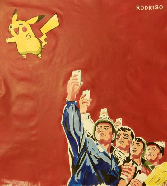 During the Pokemon go fever of 2016, I choose to depict in a humoristic way the way I perceived this trend (or call it happening). I choose to use north Korea propaganda art and replace the guns depicted in the hand of the represented figures in the original piece with smart phones! this no mock and open a debate on the chasing the yellow little monster game and its social implications. The implicit and explicit message is obvious yet multi layered. You can read this piece in different levels of interpretations depending on the angle you choose to digest, understand and project it. Humor is obviously an important part of my work too because I think it eases the passing of the message.