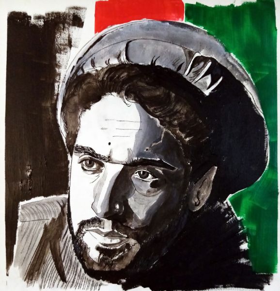 The fall of Kabul and of Afghanistan in the late summer of 2021 impacted me as a person and as an artist. I made a few pieces on the subject because of its different overwhelmingly meaningful and symbolical imagery. The first piece I made was of Zarifa Ghafari, the first and youngest female mayor ever of Afghanistan who tweeted for her life while Kabul started falling, I painted the image of the "dot people" falling from the american military plane as it left the convulsed and in crisis airport of the capital falling in the hands of the taliban. The third piece I made was this one: "Massoud the young lion" as soon as the Resistance was announced and started in the Valley of Panshjir.